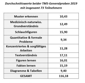Insgesamt lag die Teilnehmerzahl bei beiden Generalproben zusammen bei 73 zukünftigen Medizinstudenten. Die Durchschnittspunktwerte, die in den einzelnen Untertests erreicht wurden, könnt ihr nachfolgender Tabelle entnehmen: