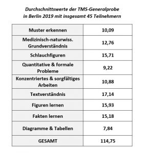 An unserer ersten TMS Generalprobe 2019, am Samstag den 6. April in Berlin haben insgesamt 45 zukünftige Medizinstudenten teilgenommen. Die Durchschnittspunktwerte, die in den einzelnen Untertests erreicht wurden, könnt ihr nachfolgender Tabelle entnehmen: